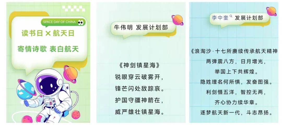 四院17所開(kāi)展“讀書(shū)日X航天日 寄情詩(shī)歌 表白航天”活動(dòng),向各部門(mén)征集航天主題的詩(shī)詞,作品韻律優(yōu)美,展現(xiàn)了航天人的豪情壯志,抒發(fā)了對(duì)航天事業(yè)的無(wú)限熱愛(ài)。