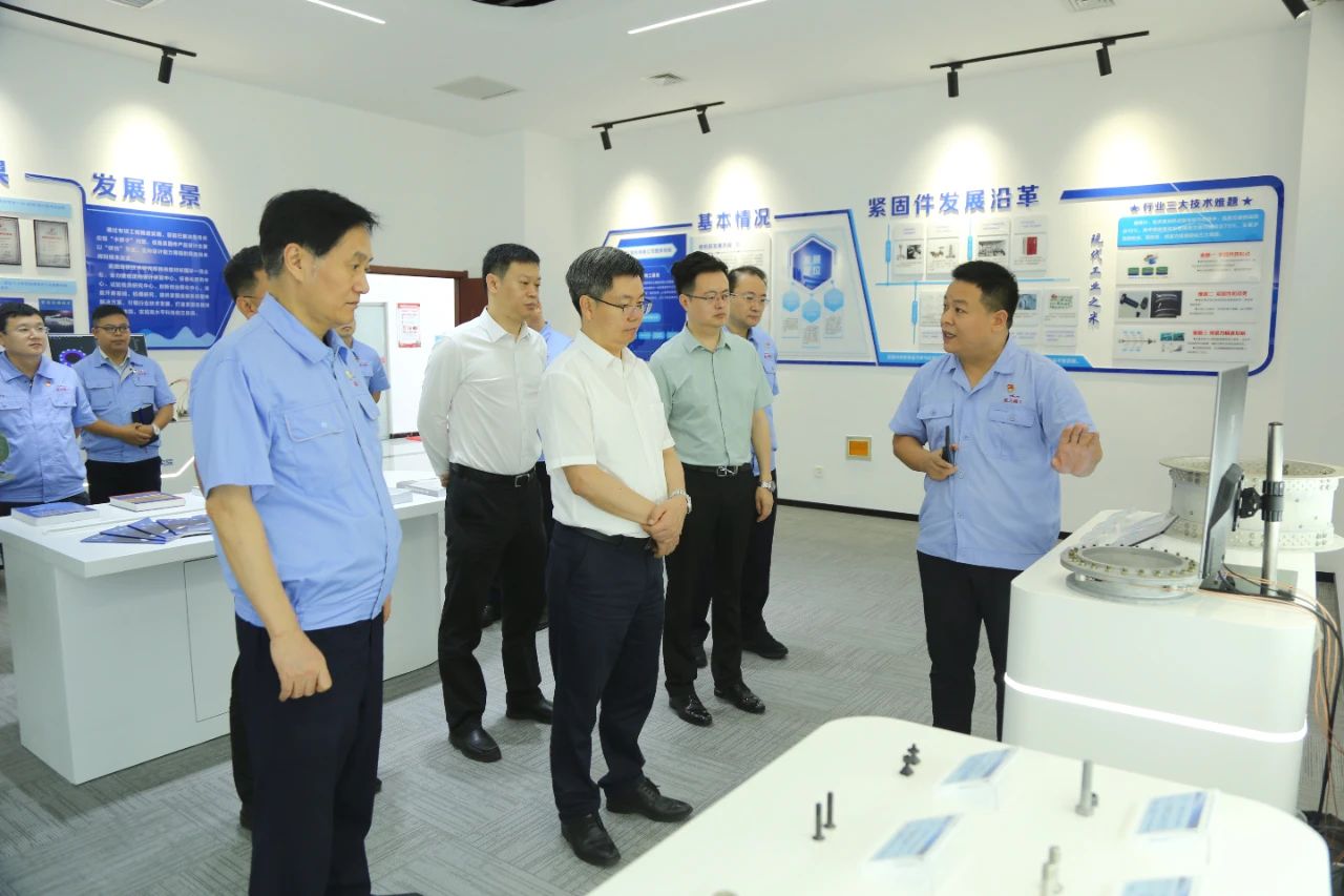 27日上午,陳錫明一行來到航天精工,深入航天精工研究院、機加鐓制車間、高端抽芯鉚釘自動化生產(chǎn)線等科研生產(chǎn)一線開展實地調(diào)研。陳錫明詳細了解了航天精工技術研發(fā)和產(chǎn)品配套等方面情況,聽取了航天精工關于生產(chǎn)經(jīng)營、發(fā)展規(guī)劃、黨的建設和巡視整改等方面的情況匯報。