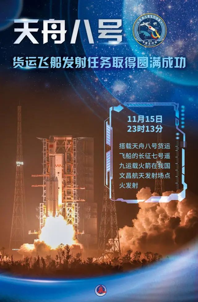 搭載天舟八號貨運(yùn)飛船的長征七號遙九運(yùn)載火箭,于北京時間11月15日23時13分在我國文昌航天發(fā)射場點(diǎn)火發(fā)射。