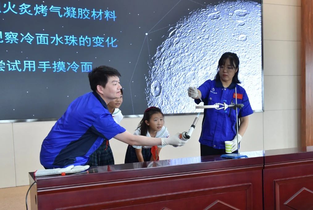 升旗儀式結(jié)束后,306所青年科技工作者廖博士為云崗小學(xué)師生帶來了一堂題為《煙火里的塵?!教觳牧霞{米氣凝膠》的科普課。課堂上,通過趣味講解、實(shí)物展示、模擬試驗(yàn)、互動(dòng)問答等形式,對(duì)這種已經(jīng)成功運(yùn)用于長(zhǎng)征五號(hào)運(yùn)載火箭、嫦娥四號(hào)月球探測(cè)器等航天器上的新型航天材料進(jìn)行了現(xiàn)場(chǎng)揭秘,并為同學(xué)們介紹了氣凝膠研制團(tuán)隊(duì)不為人知的研發(fā)故事。互動(dòng)環(huán)節(jié),學(xué)生們走上講臺(tái)親自操作實(shí)驗(yàn)儀器,零距離驗(yàn)證氣凝膠材料的優(yōu)異性能。在充滿樂趣的課堂上,同學(xué)們學(xué)習(xí)了航天知識(shí),感受到航天科技的魅力。