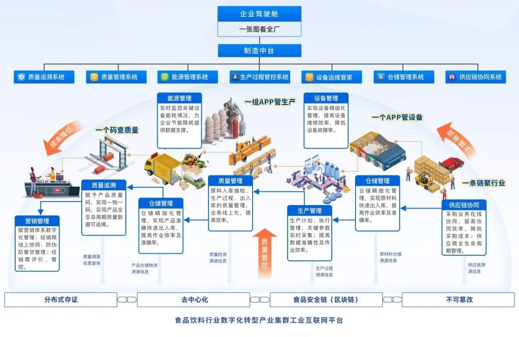 航天云網(wǎng)公司自主開(kāi)發(fā)的“食品飲料行業(yè)數(shù)字化轉(zhuǎn)型(全域)解決方案”聚焦食品企業(yè)關(guān)注提升生產(chǎn)效率、降低運(yùn)營(yíng)成本、加強(qiáng)質(zhì)量管控等需求,從產(chǎn)品鏈和價(jià)值鏈深度融合的角度出發(fā),提供數(shù)字化轉(zhuǎn)型全域解決方案,涵蓋產(chǎn)品全生命周期管理系統(tǒng)、銷售管理系統(tǒng)、供應(yīng)鏈協(xié)同系統(tǒng)、生產(chǎn)過(guò)程管控系統(tǒng)、質(zhì)量管理系統(tǒng)、質(zhì)量溯源系統(tǒng)、設(shè)備運(yùn)維管家、能源優(yōu)化系統(tǒng)、倉(cāng)儲(chǔ)管理系統(tǒng)、成本分析系統(tǒng)等12款應(yīng)用系統(tǒng)產(chǎn)品集。目前,該方案已賦能廣東、貴州、甘肅等多個(gè)省市數(shù)十家企業(yè)實(shí)現(xiàn)數(shù)字化轉(zhuǎn)型,助力制糖、飲用水、食品添加劑、飲料、啤酒等細(xì)分行業(yè)企業(yè)實(shí)現(xiàn)提質(zhì)降本增效。