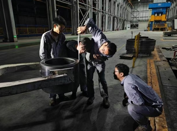 車間內(nèi),叉車的轟鳴奏響了奮斗的旋律。一位叉車司機(jī)熟練地操作設(shè)備,將鍛件穩(wěn)穩(wěn)抓起。名技術(shù)、生產(chǎn)骨干迅速圍攏過來,手中的卷尺成為他們攻克技術(shù)難題的有力“武器”。他們專注地測量每一處尺寸,目光在鍛件與測量數(shù)據(jù)間來回切換,不放過任何一個細(xì)節(jié)。
