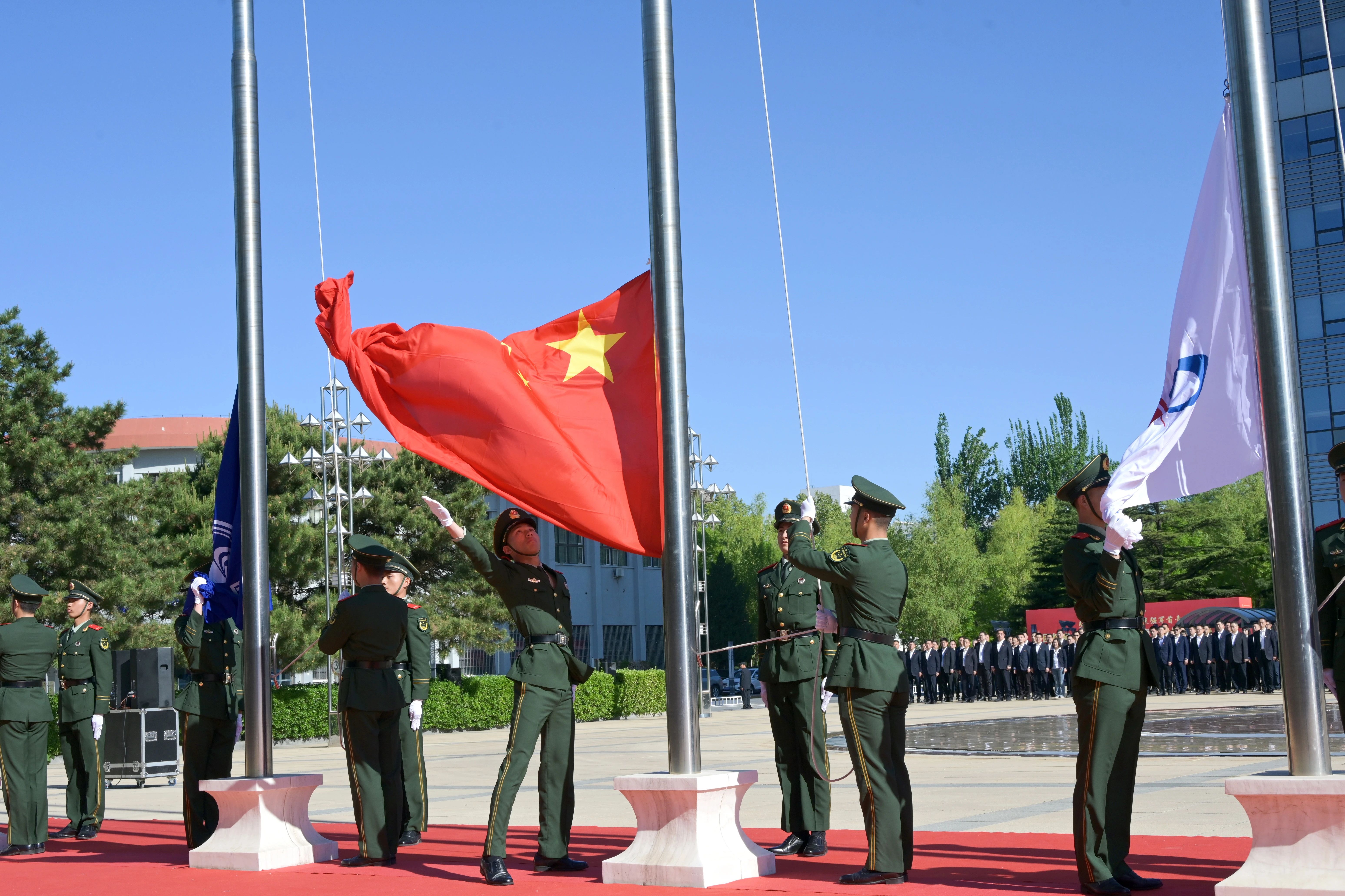 8點(diǎn)30分,國(guó)旗護(hù)衛(wèi)隊(duì)邁著鏗鏘有力的步伐,護(hù)送鮮艷的五星紅旗,昂首闊步走向升旗臺(tái)。伴隨著雄壯的國(guó)歌和航天科工之歌,國(guó)旗、集團(tuán)公司司旗和三院院旗冉冉升起,在場(chǎng)干部職工莊嚴(yán)肅立,行注目禮。