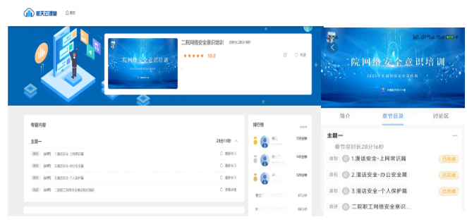在航天云課堂開設線上網絡安全意識培訓和趣味競賽,主要包括個人信息保護、辦公安全、人工智能安全等網絡安全知識。全院5700余人次積極參加在線培訓和競賽,130余名員工勇闖百關,通過寓教于樂普及網絡安全知識。