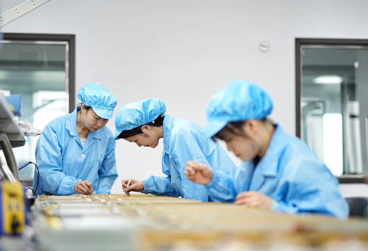 近年來,電裝組邁步向現(xiàn)代化生產模式轉型,在工藝、技能上不斷創(chuàng)新,幫助公司多個重要型號實現(xiàn)核心組件功能。在金屬背板上,0.2毫米的棱形角比芝麻還小,她們卻以線槍為“針”,將直徑0.4毫米的絞線精準纏繞;在被稱為“微雕”的加工工序上,她們將不足發(fā)絲一半粗的導線,焊接在寬度一致的印制板線路上,不僅能精準把握細如流絲的用錫量,還能完美復刻印制板的金屬紋路圖案。