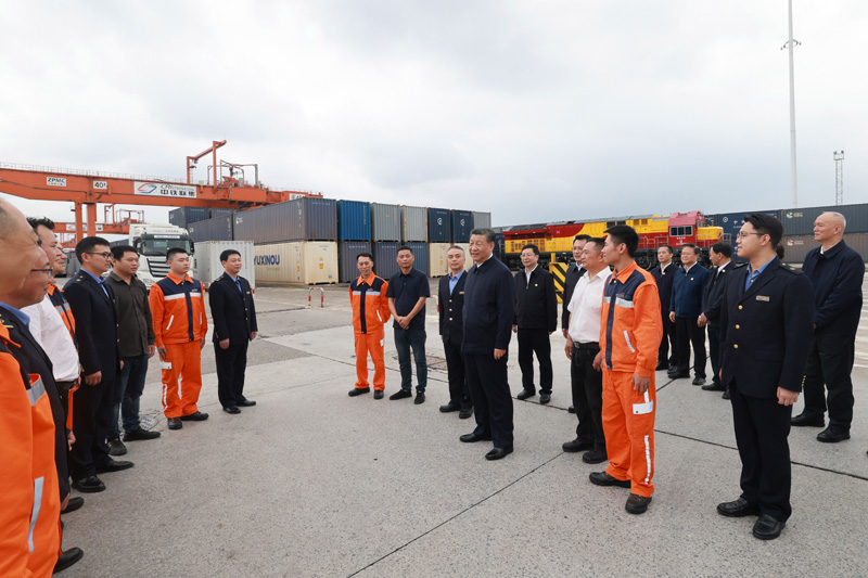 4月22日至24日,中共中央總書記、國(guó)家主席、中央軍委主席習(xí)近平在重慶考察。這是22日下午,習(xí)近平在重慶國(guó)際物流樞紐園區(qū)重慶鐵路集裝箱中心站,同貨車司機(jī)、列車司機(jī)、裝卸工人、場(chǎng)站管理人員等親切交流。