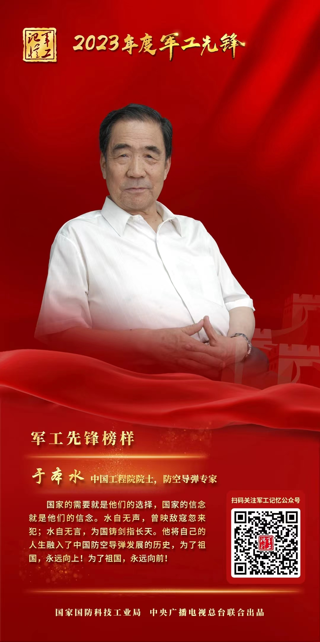 2023年12月28日晚,由中央廣播電視總臺(tái)軍事節(jié)目中心和國(guó)家國(guó)防科技工業(yè)局新聞宣傳中心聯(lián)合打造的年度重點(diǎn)特別節(jié)目《軍工先鋒》在CCTV-7國(guó)防軍事頻道播出。我國(guó)著名防空導(dǎo)彈專家于本水院士當(dāng)選2023年度“軍工先鋒榜樣”。
