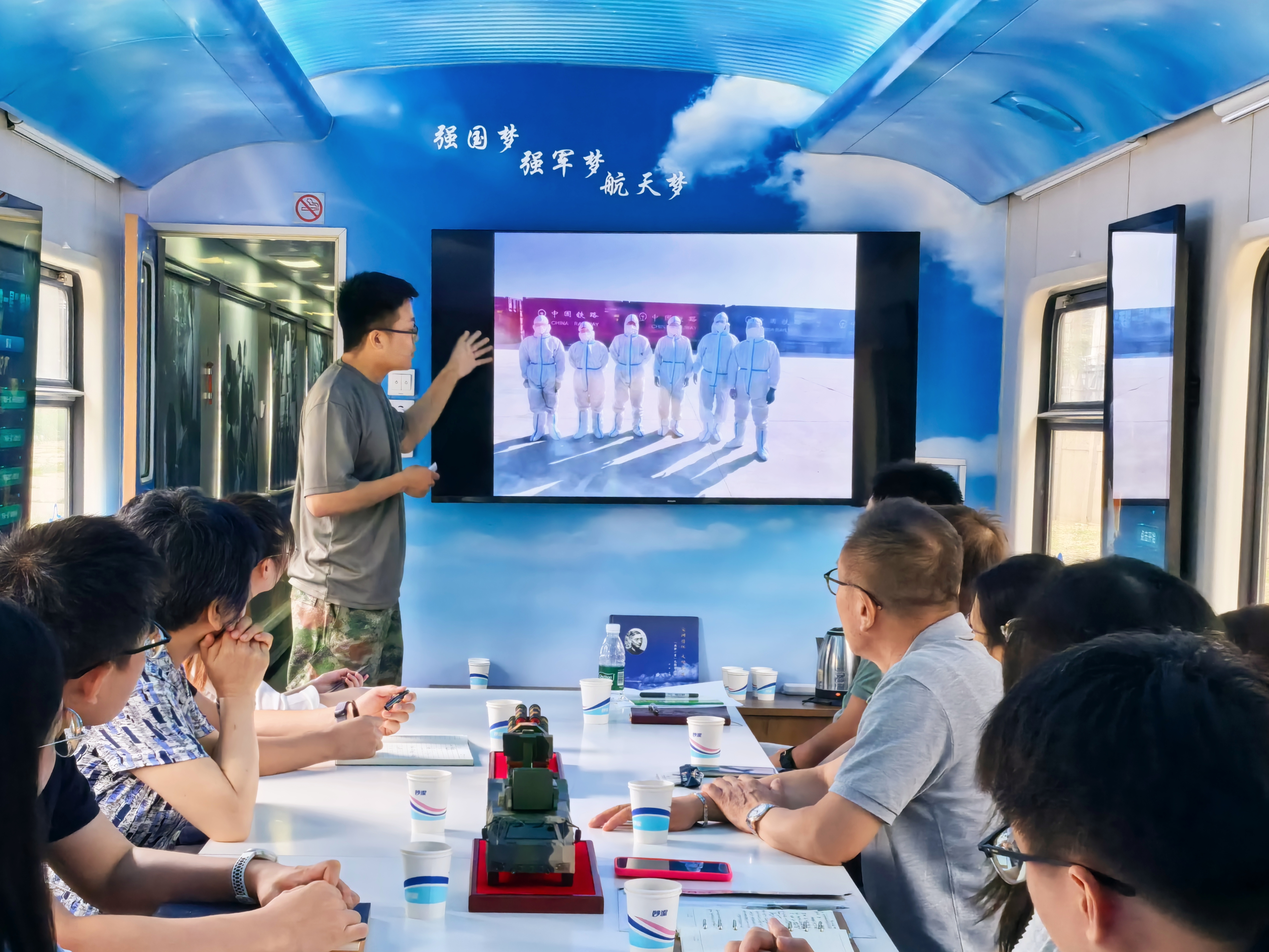 活動伊始,大家踏上“紅藍專列”。這是中天鵬宇公司以自營多年、奔波馳騁在轉(zhuǎn)運戰(zhàn)線上的鐵路自備車為載體而建成的數(shù)字化黨建文化移動陣地和“兩彈一星”精神傳播陣地。在“紅色專列”上,大家依次參觀了“初心學堂”“偉大歷程”和“航天報國”三個展區(qū),通過數(shù)字化顯示屏和展板載體、全景式噴繪和實物布展,沉浸式感受偉大的建黨精神,體悟蘊含其中的信仰力量、精神力量和傳承力量;在“藍色專列”上,大家通過參觀“功勛引領”“筑夢之路”“歷史光影”“精神傳承”和“互動問答”五個板塊,“瞻其人、觀其程、學其神、聽其聲、覺其思”,深入感悟“兩彈一星”精神的深刻內(nèi)涵和時代價值。